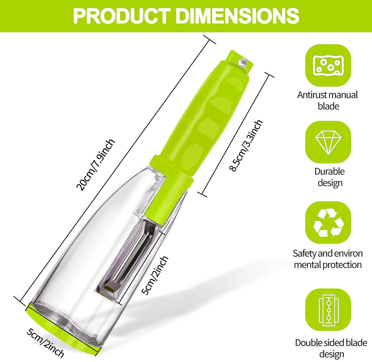 Multi-Functional: Standard vegetable peeler for peeling hard skin veggies and fruit easily; Julienne peeler for cutting veggies into even strips great for salads, pasta garnishes, etc.; Cutter inserted for additional food cutting or slicing. ?Storage Function: With storage function, easy collect peels when peeling fruit or vegetable., potato, tomato, cucumber, cabbage, apples, kiwi, etc. Ergonomic Design:?The handle of Peelers for Kitchen is designed for a comfortable and non-slip grip, even when wet. Material:?stainless?steel?+ABS?plastic; Product?size?:?as the picture shows; Included:1x?Storage?Peeler.
