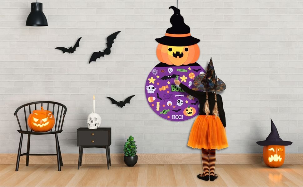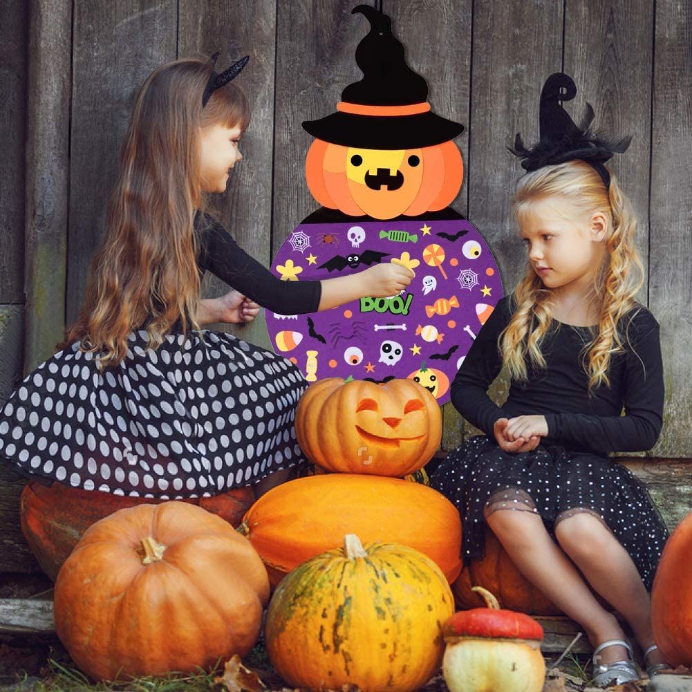 Halloween just got more fun with this Felt Halloween Pumpkin Witch to decorate! FUN-?This felt Halloween Witch goes along with any holiday decor. Children and adults will find this interesting and fun to decorate. COLORFUL-?The Halloween is a time for giving and sharing, the simple decor reminds us the spirit of the season is all about love and joy of being together with your loved ones. A GREAT?GIFT FOR LEARNING TOO?- This activity is fantastic to practice hand use, vocabulary, hand eye coordination, fine motor skill & color recognition, will be the perfect gift for your little toddler for Halloween. How are they packed??The set is sent folded, when it arrives, you can use an slightly warm iron to make it perfect and ready to hang on a wall or door. What's Included??The base Pumpkin witch and all the accessories you see to decorate. This comes ready to use. What are they made out of??All components are high quality durable felt. It can be hung on a wall or door or play on the floor. They can be put away and reused again year after year. Are they reusable??Yes! You can pack them away and reuse them year after year. Do they stick directly to the wall??This DOES NOT directly stick to the wall. There is a loop at the top you can use to hang it up. You hang it on the wall or door, so nothing gets ruined. Use a hook, a nail or a wreath hanger. The choice is yours. You can also use command strips or double stick tape or tacks to secure it more if you wish. They do not need to stick to the wall for play. The kids also loved using them just layed out on the floor. Who enjoys this?? Perfect for day cares, schools, churches and homes. Great for children over?3 years old. The creative pieces are useful to build and unlock a childs imagination. Please do not allow children to put the felt pieces in their mouth. Please supervise small children.
