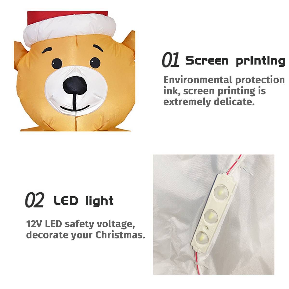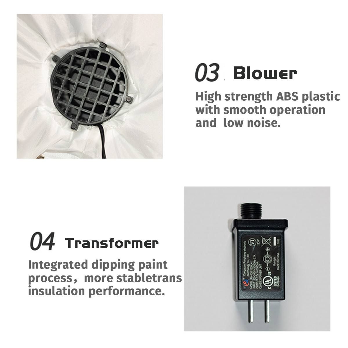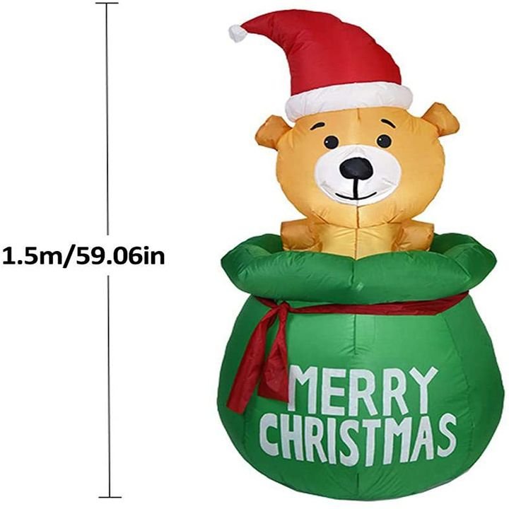 Quick Inflation:?Just connect your air blower to the inflatable and turn on the air blower, and the inflatable can be inflated in a few seconds. Premium Quality:?The inflatable set is easy to use, which will be a high-end and luxurious suits. Wide Applications:?The inflatable is suitable for Christmas indoor/outdoor courtyard garden decoration. And it can be used for Christmas event decorations, Christmas eve events, party Christmas props, classroom decorations and more. Premium Air Blower:?The air blower is made of high-strength ABS plastic, which is high-speed, low-noise air blower, and the pressure-transforming tool adopts integrated dipping process, and it features plug and play, which is convenient and fast. Polyester Cloth:?The inflatable features the high-quality polyester cloth, thus making it the one can be folded next year, and you can use it again next year. Packing List: Inflatable*1, Pressure-transforming Tool*1, Air Blower*1, Led Light*2, Ground Stake*2, String for Fixing*2.