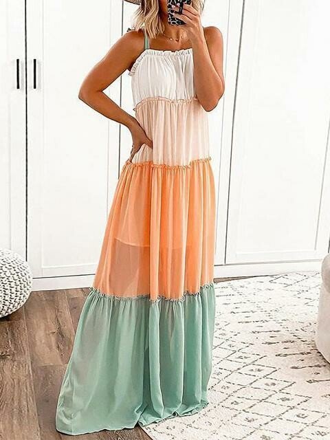 Material: Polyester; Style: Casual; Collar: Straps; Pattern Type: Color Block; Clothing Length: Maxi; Sleeve Length: Sleeveless; Color: as the picture show; Occasion: Daily Casual, Party, Holiday, Basic; Garment Care: Hand Wash/Machine Washable.Tumble dry low. Do not bleach.