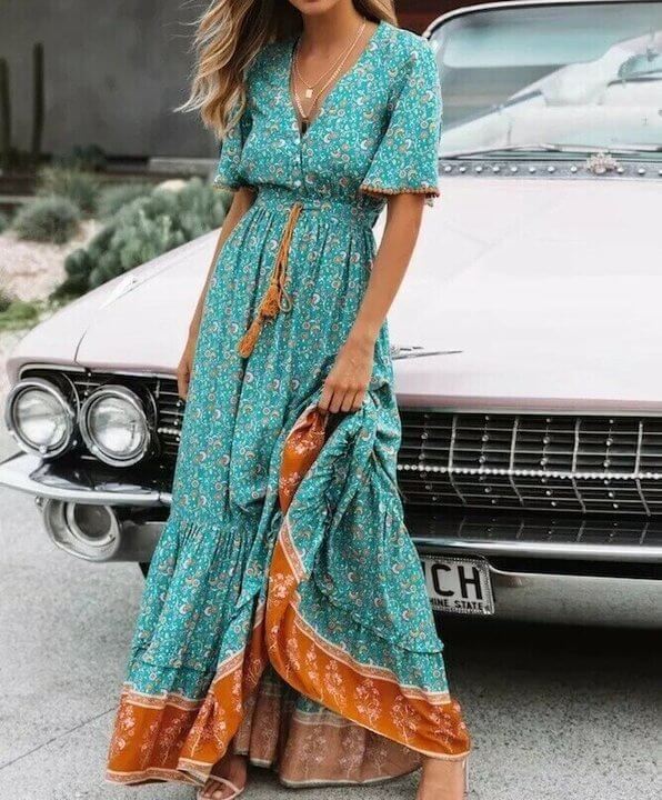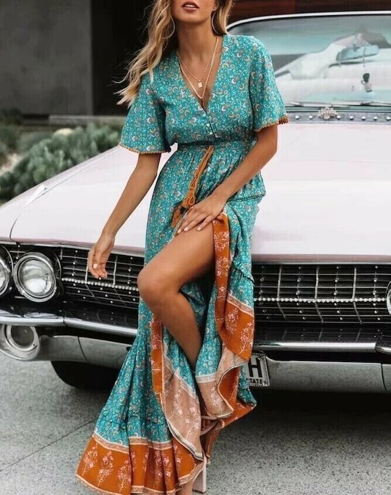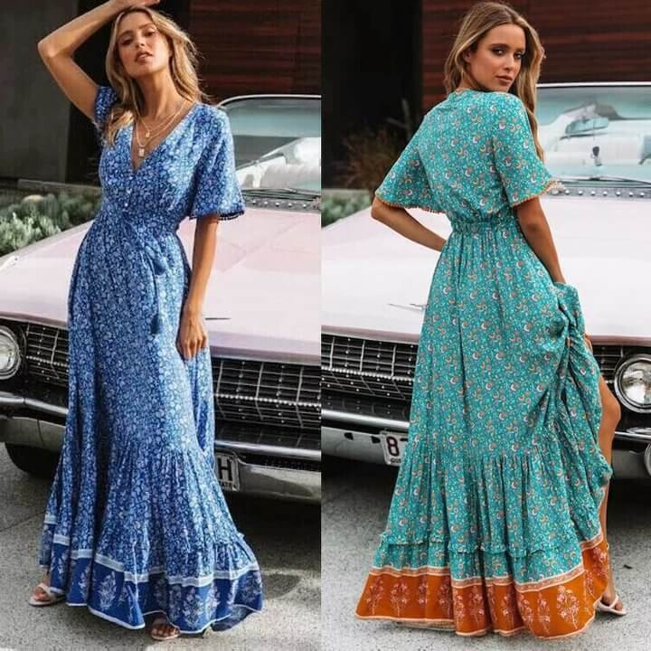 Suitable season: Summer and Spring; Color: as the picture show; Material: cotton + polyester; Dresses Length: Maxi Dress; Collar: V-neck collar; Waist Type: High Waist; Sleeve Style: Half Sleeve.