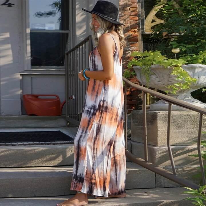 Collar: V Neck; Sleeve Length: Sleeveless; Clothing Length: Maxi; Fit Type: Loose; Material: Cotton Blending; Color: as the picture show; Washing Mode: Machine Washable; Package Include: 1PC Women Dress.