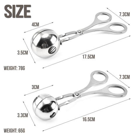 They Are Very Nice and Easy for Making Equal Portions of Meatballs.?Saving Half of Your Making Time! The?Stainless Steel Meatball Maker?will help you?make restaurant-style meatballs?right in your own home?using scissor-grip action.?Just scoop your ground meat and close the handles to form meatballs.?Enjoy your kitchen life. Premium material.?Food grade stainless steel meatball maker.?It is?made of non-toxic and durable stainless steel,?won't tarnish or oxidize easy, high strength, corrosion resistance, high-temperature resistance. Convenient and easy to Use.?With?clip head opening design.?Put chopped meat on the scoop, then clip it, the excess meat will squeeze out from the hole. Remove the excess meat and easily complete the meatball production. Material:?Stainless Steel; Color:?Silver; Size:?S(3.3 x 16.5 x 7.3cm) / L(3.5 x 17.5 x 7.3cm).